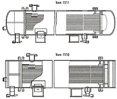 Серийно выпускаемые промышленностью кожухотрубные ПП соответствуют требованиям ГОСТ 28679-90 «Подогреватели пароводяные систем теплоснабжения. Общие технические условия». Конструктивно они относятся к кожухотрубным теплообменным агрегатам горизонтального типа, состоящим из следующих основных функциональных элементов: