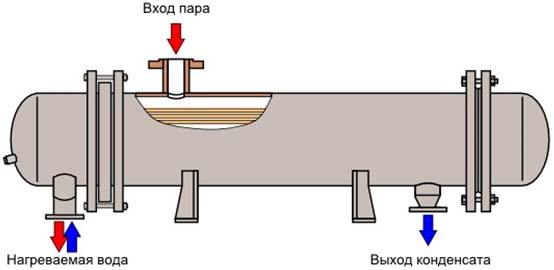 Нагрев воды происходит в процессе теплообмена между греющим паром, поступающим в межтрубное пространство кожуха, и водяным теплоносителем, движущимся внутри теплообменных трубок трубной системы. Остывший пар конденсируется и выводится из кожуха через специальный патрубок. Для более эффективного теплообмена используется многоходовость водяного потока, за счет которой возрастает скорость движения воды внутри трубок. Промышленностью выпускаются двух- и четырехходовые ПП, в которых перегородками внутри передней водяной камеры создаются два или четыре хода водяного потока.