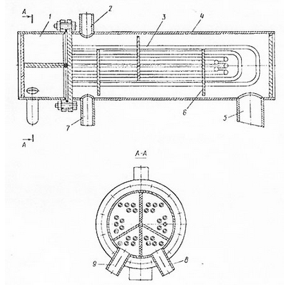 Основные элементы конструкции изделия — корпус с расположенной внутри его трубной системой. Трубки изготавливаются из латуни или стойкой к воздействию коррозии стали. По ним циркулирует взятая из исходного потока химически очищенная вода. Трубная система состоит из торцовых трубных досок с завальцованными трубками. В зависимости от количества трубок и конфигурации их соединения в одну систему, обеспечивается одно-, двух- или четырёхходовой контур теплообменника.
