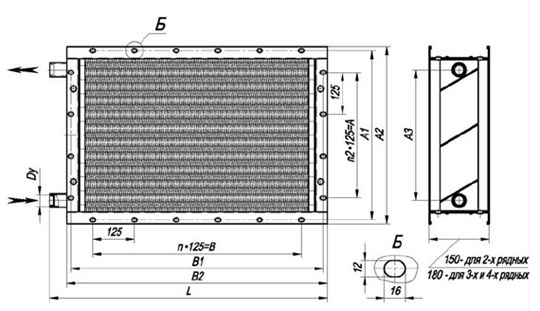 Рабочей средой служит горячая либо перегретая вода при температуре до +190оС. Четырехрядная структура теплоотдающих элементов увеличивает эффективность нагрева воздуха. Их располагают в шахматном порядке. Теплоноситель совершает 4 (6) ходов. Отопительное оборудование в холодное время года должна иметь скорость запуска не более 30 градусов в час. Площадь фронтального сечения составляет 0.581 кв.м., средняя площадь сечения для прохода теплоносителя – 0.00056 кв.м.