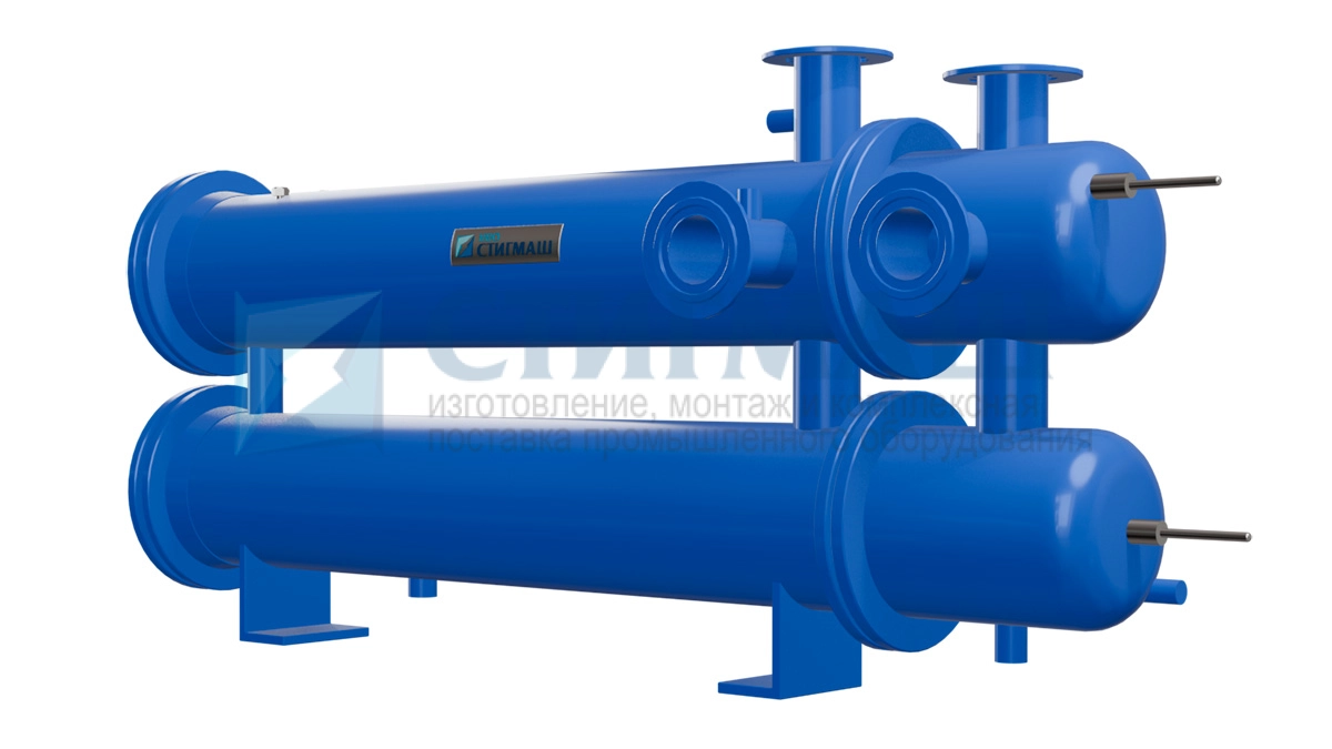 Охладитель конденсата ОГ-12М модернизированный представляет собой горизонтальный водоводяной теплообменник, состоящий из двух секций. Площадь теплообмена охладителя составляет 12 м2. Обе секции идентичны друг другу, соединены последовательно по обоим теплоносителям, которые направлены в противотоке.