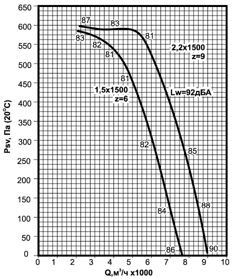 Основные части вентилятора: рама, короб, диффузор, два кармана электродвигатель и рабочее колесо с 6 или 9 лопатками, загнутыми назад. Номер типоразмера соответствует диаметру рабочего колеса в дециметрах.