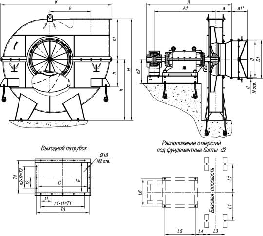 Габаритные и присоединительные размеры вентиляторов ВМ (90°)