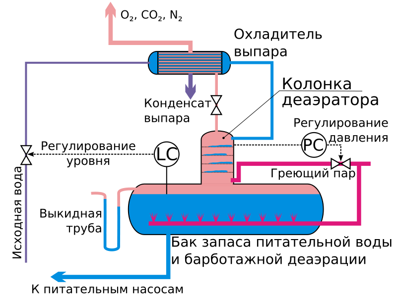 Основной пар подаётся в БДА, вентилирует паровой объём и поступает в колонку. Во время прохождения через отверстия барботажной тарелки пар догревает воду до температуры насыщения, вследствие чего из воды удаляются микроколичества газов.