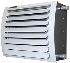 Строение воздухонагревателей, работающих на горячей воде, сводится к заключению в металлический блок-корпус стального теплообменника с пластинчатым алюминиевым оребрением и осевого или радиального вентилятора.