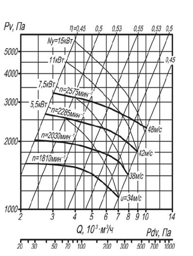 На границах рабочего участка аэродинамические уровни звуковой мощности на 3дБ выше уровня звуковой мощности, соответствующего номинальному режиму работы вентилятора.
