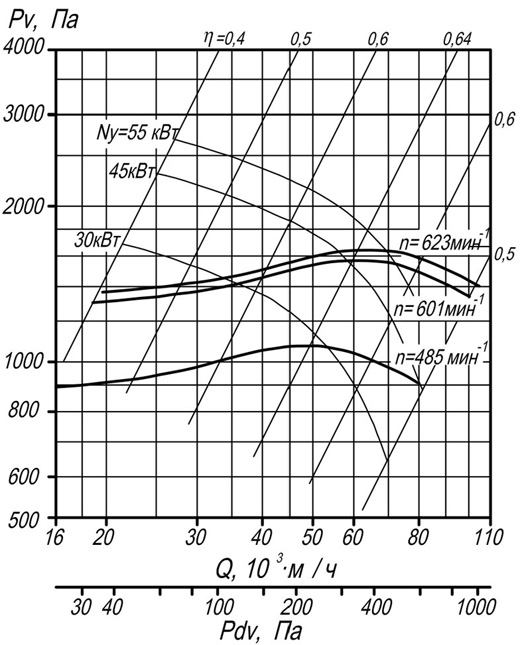 | Типоразмер | Мощность, кВт/об | производительность, м?/час | Полное давление, Па | ||||